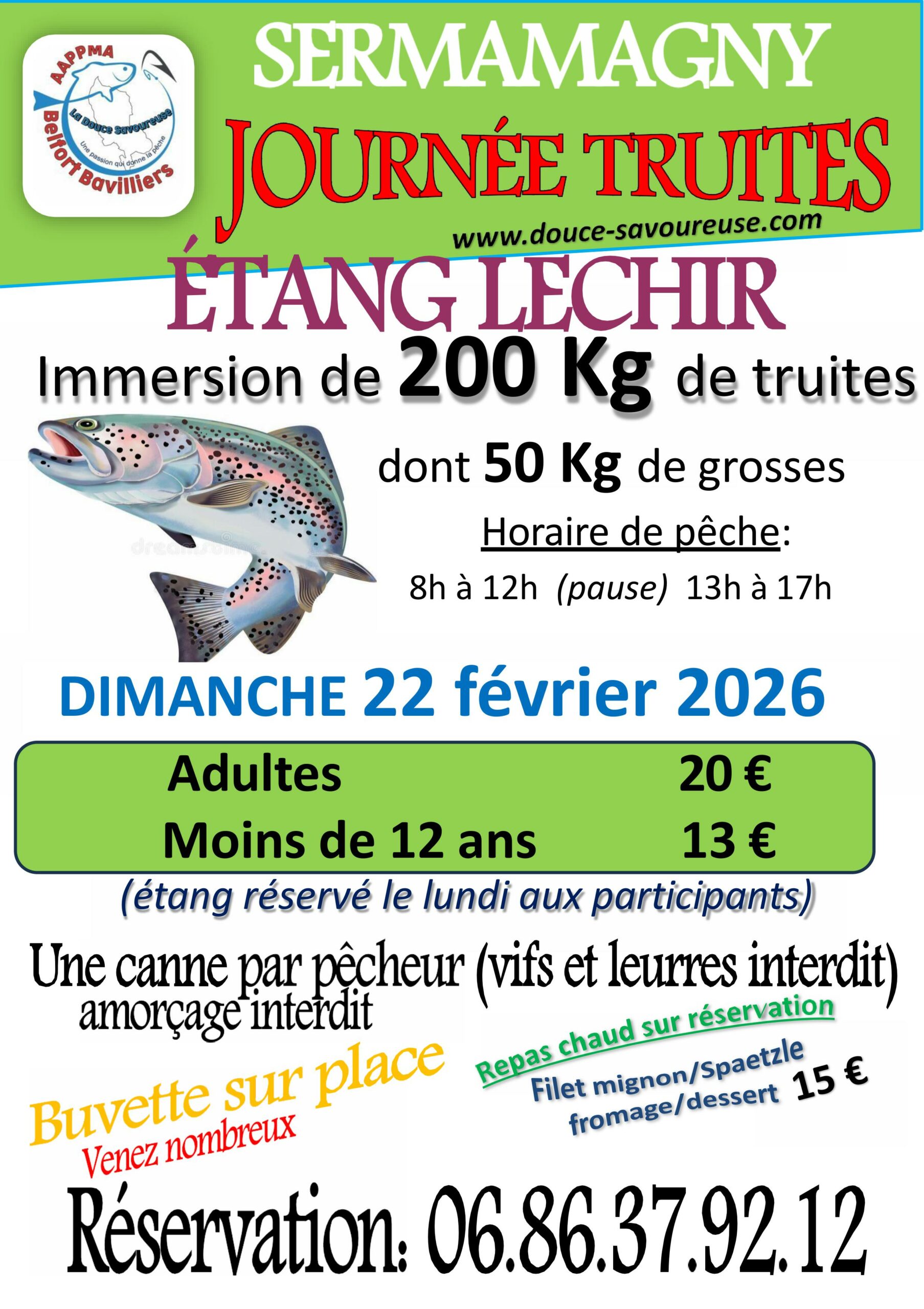 Dimanche 22 février 2026, l’AAPPMA Belfort Bavilliers organise une journée pêche à la truite à l’étang LÉCHIR, situé à Sermamagny (Route d’Éloie).