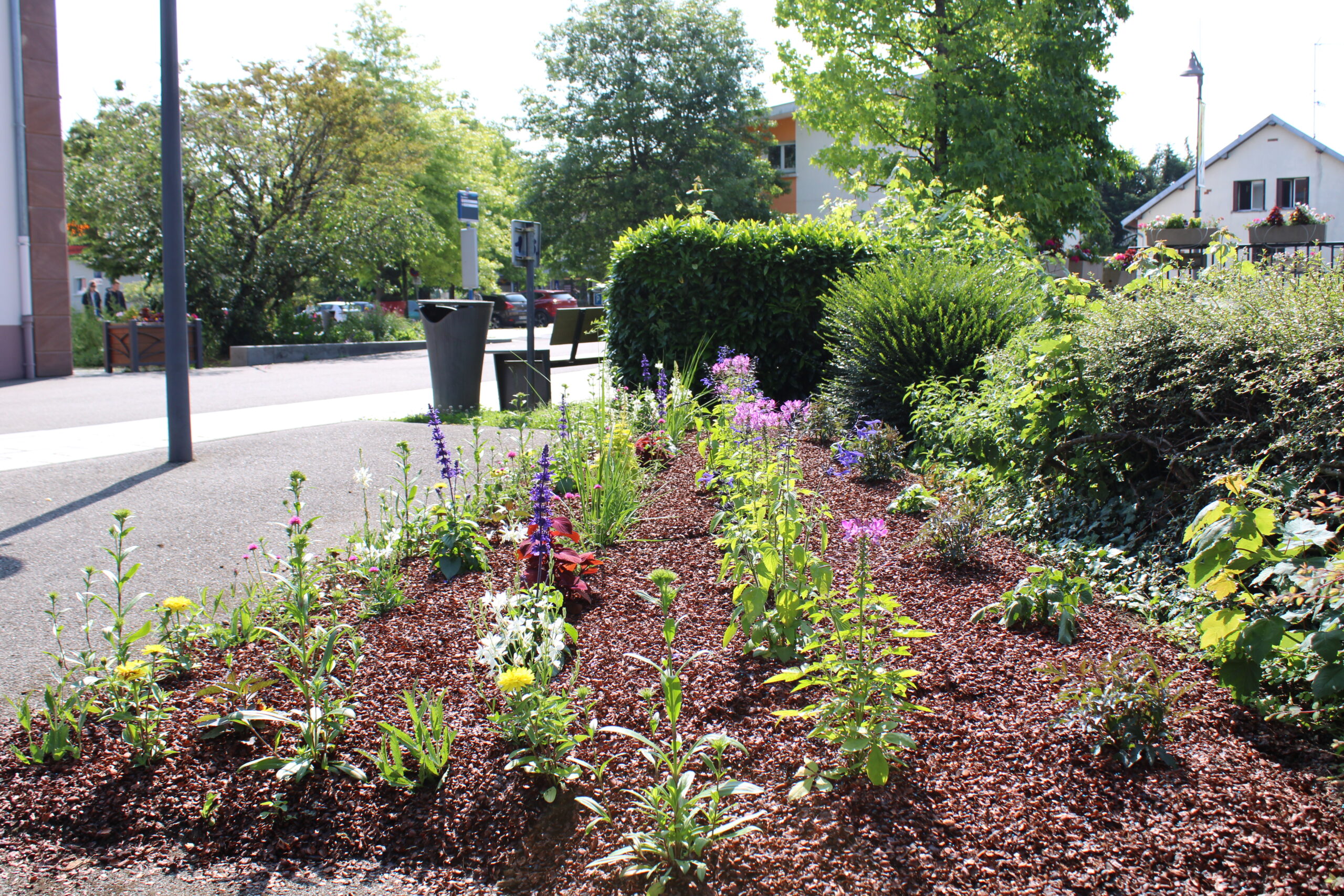 La sélection des espèces végétales s’inscrit dans une démarche responsable. Géraniums, zinnias, sauges… Au-delà de leur beauté et de leur floraison généreuse, ces plantes ont été choisies pour leur faible consommation en eau. Une attention particulière a été portée à la sobriété hydraulique, dans un contexte où le dérèglement climatique nous invite à adapter nos pratiques.