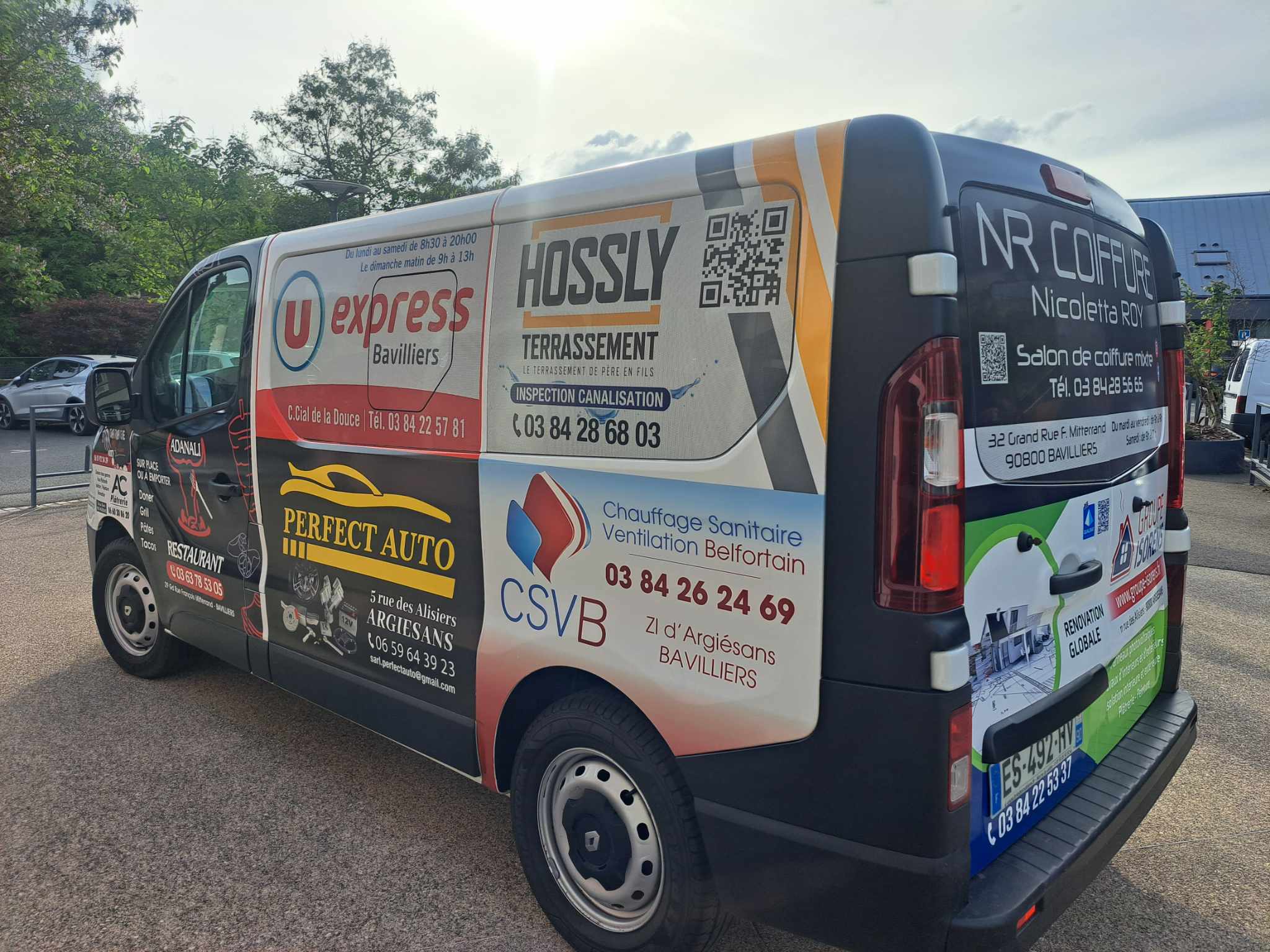 Le mini bus a la particularité d’avoir été entièrement financé par la publicité d’entreprises et de partenaires locaux.