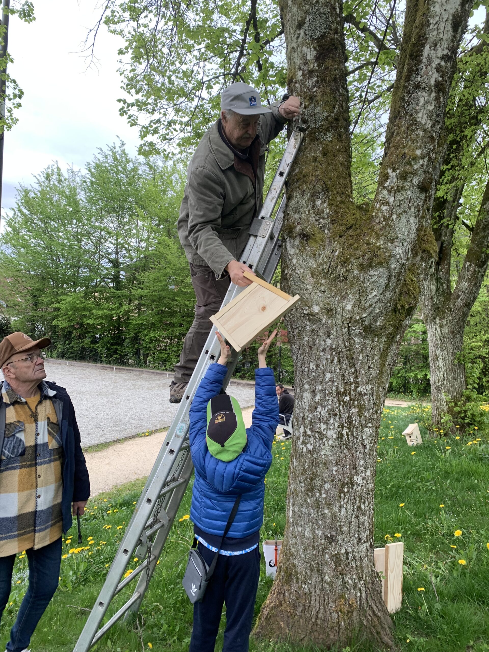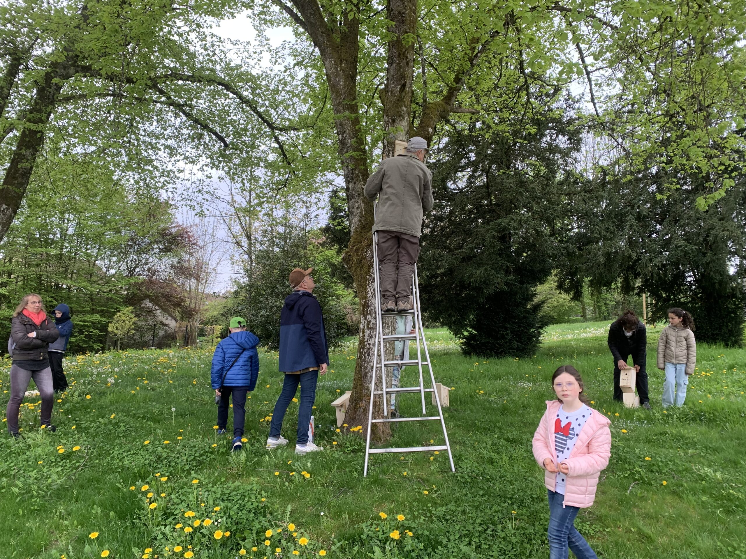 Chaque modèle est adapté aux besoins spécifiques des espèces ciblées : trou d’envol de 26 mm pour les mésanges bleues, 30 mm pour les mésanges charbonnières. Moineaux et étourneaux peuvent également y trouver refuge. Le 24 avril, les enfants accompagnés de leurs parents ont parcouru le parc de la Fraternité pour installer une première série de nichoirs.