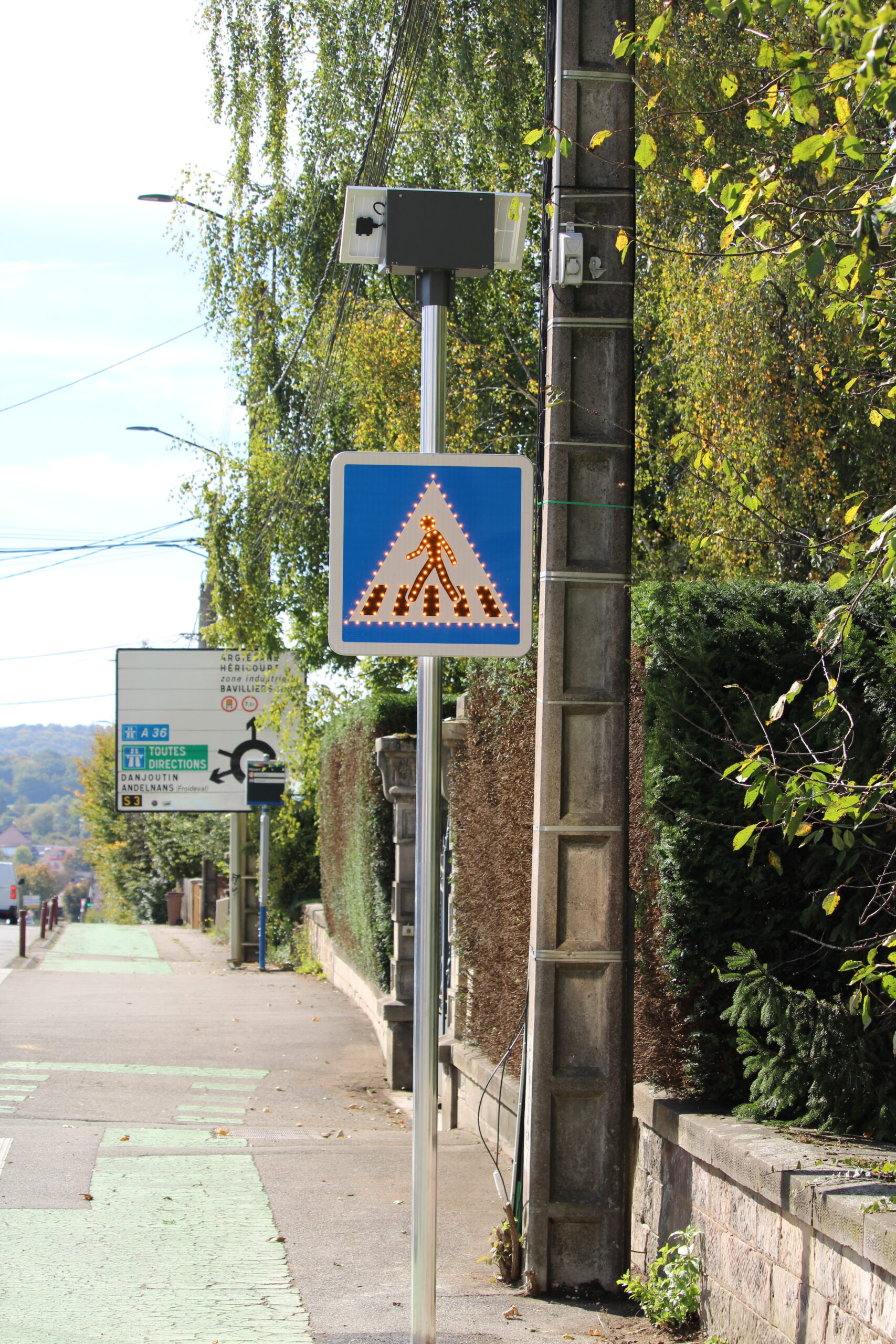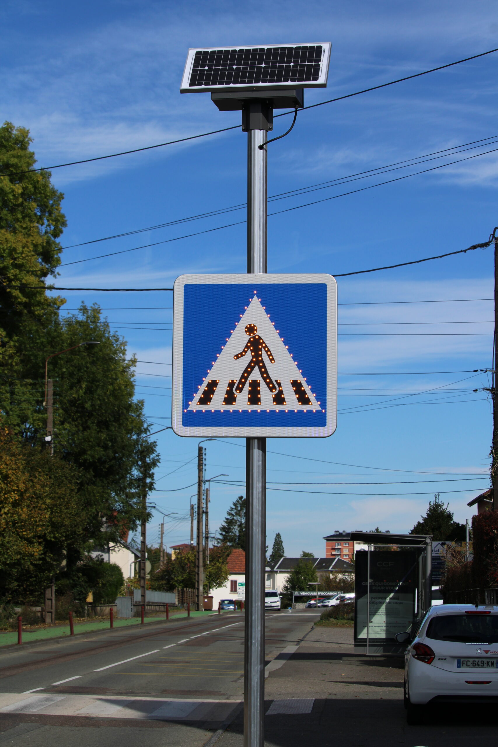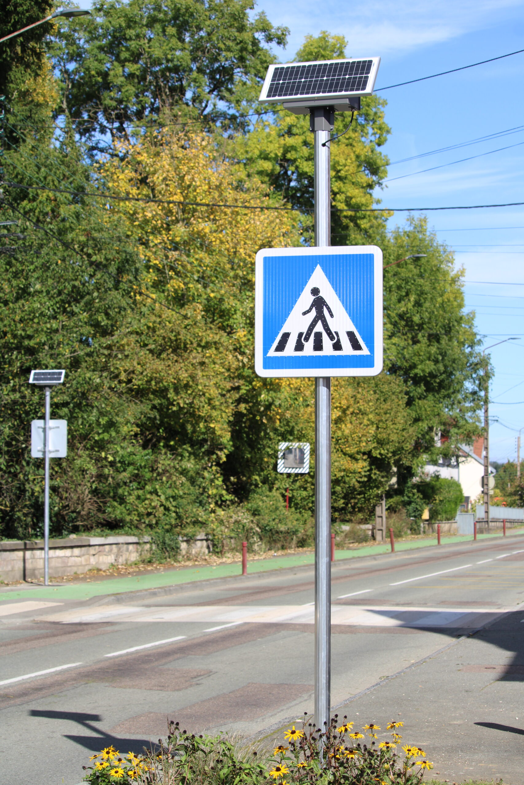 Les panneaux, commandés auprès de Signaux Girod, sont alimentés par un système photovoltaïque autonome, garantissant leur fonctionnement de jour comme de nuit sans raccordement au réseau électrique. Placés de part et d’autre de la chaussée, ils permettent aux automobilistes d’identifier clairement la position du passage piéton, renforçant ainsi la sécurité des piétons.