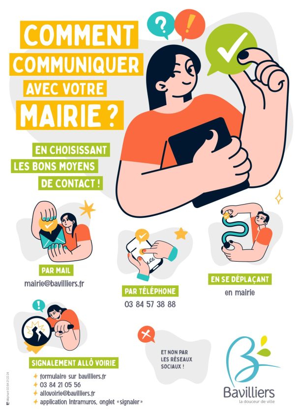 Au quotidien, la Ville de Bavilliers veille à rester à l’écoute de ses habitants. Propreté, voirie, éclairage public, espaces verts, interrogations diverses ou suggestions : vos remarques et signalements sont essentiels pour permettre à la municipalité d’intervenir efficacement. Encore faut-il qu’ils nous parviennent par les bons canaux !