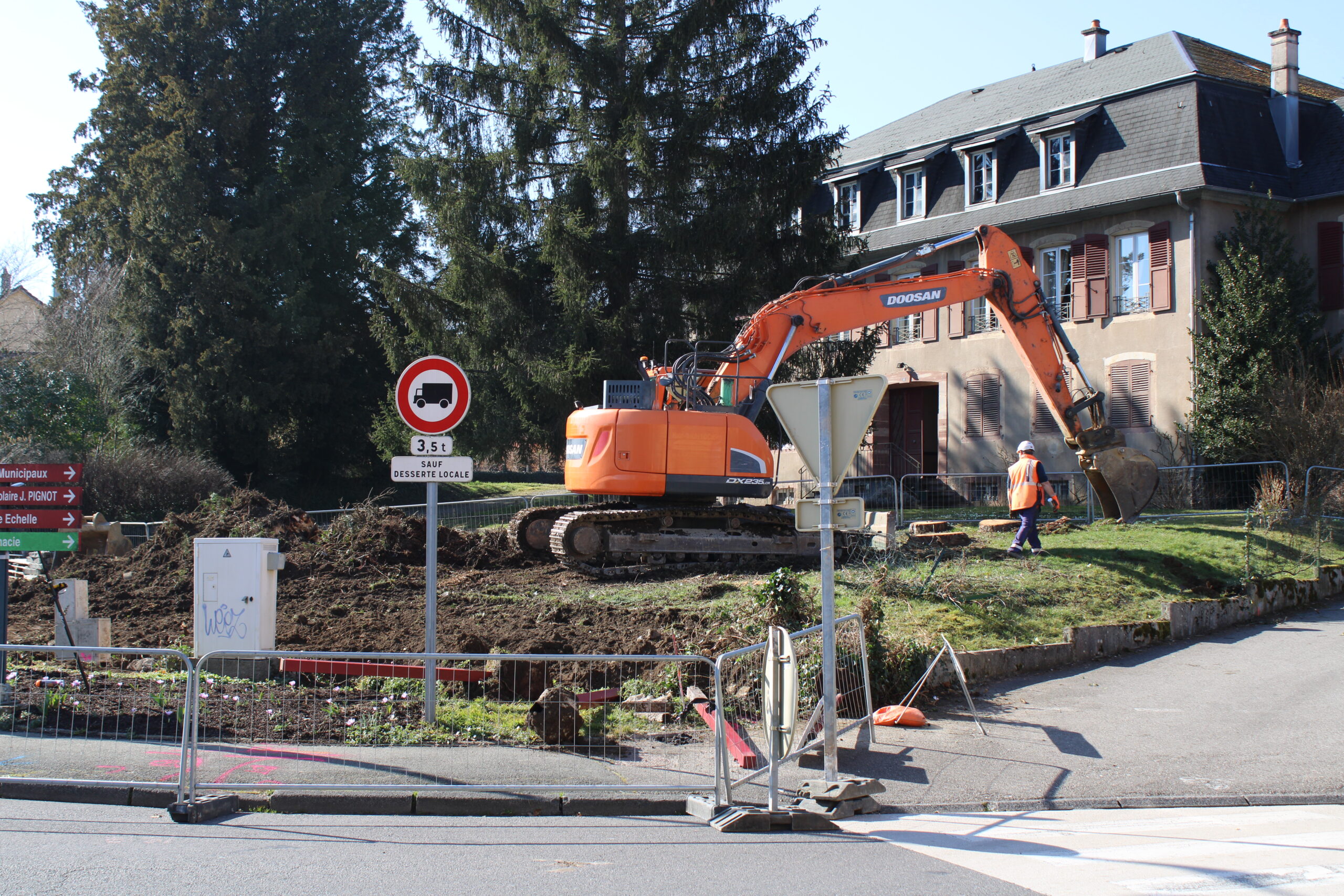 Après le giratoire de la Charmeuse et le plateau surélevé au carrefour de la rue des écoles, la Ville de Bavilliers poursuit ses efforts pour fluidifier la circulation et sécuriser les déplacements. Depuis quelques jours, un nouveau chantier a débuté à l’intersection des rues François-Mitterrand et de la Libération. Objectif : aménager un giratoire à cet emplacement stratégique afin de faciliter la traversée du centre-ville.